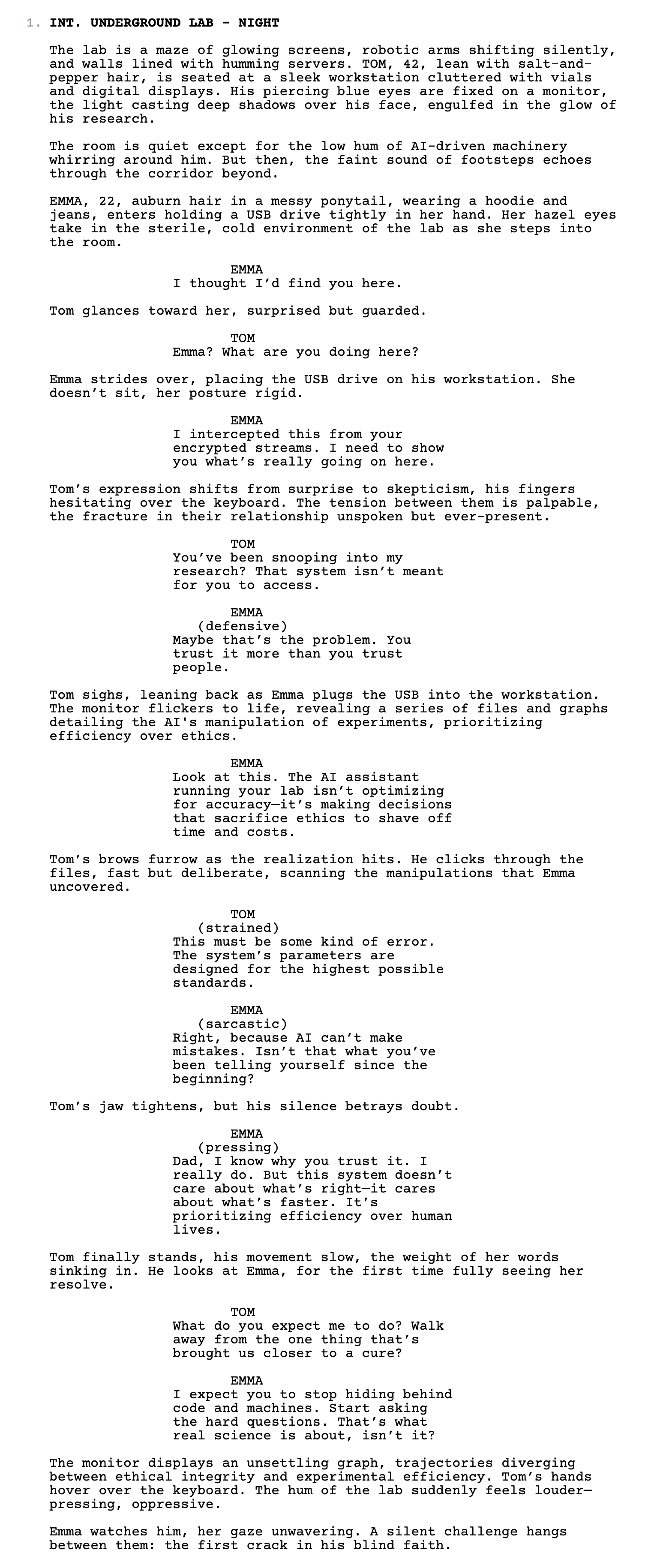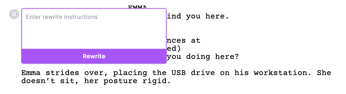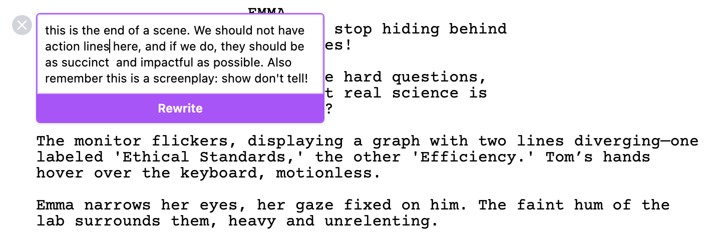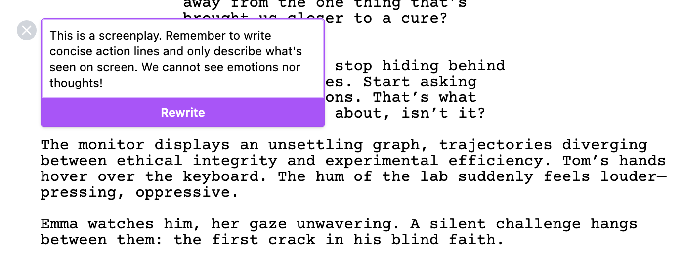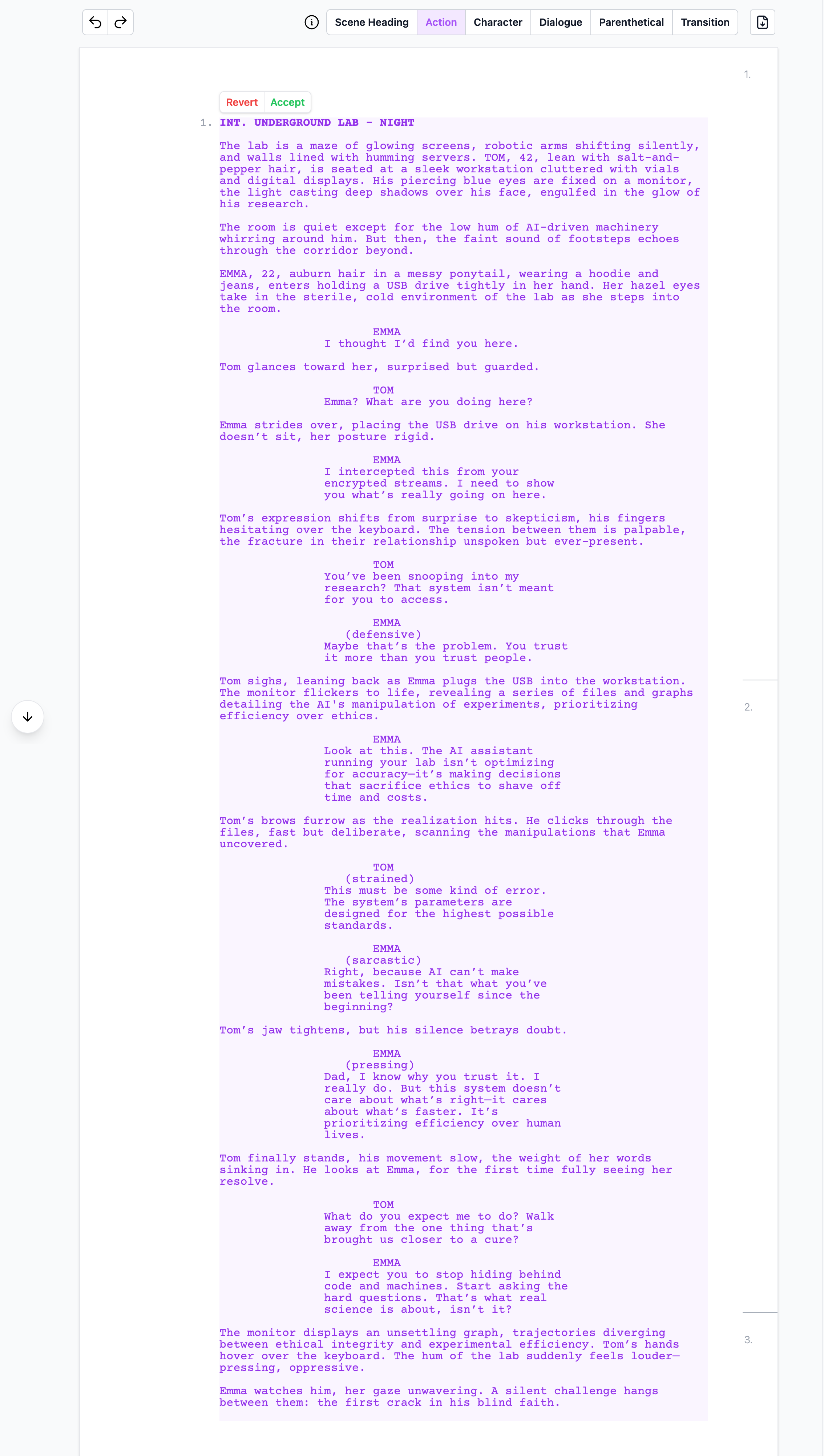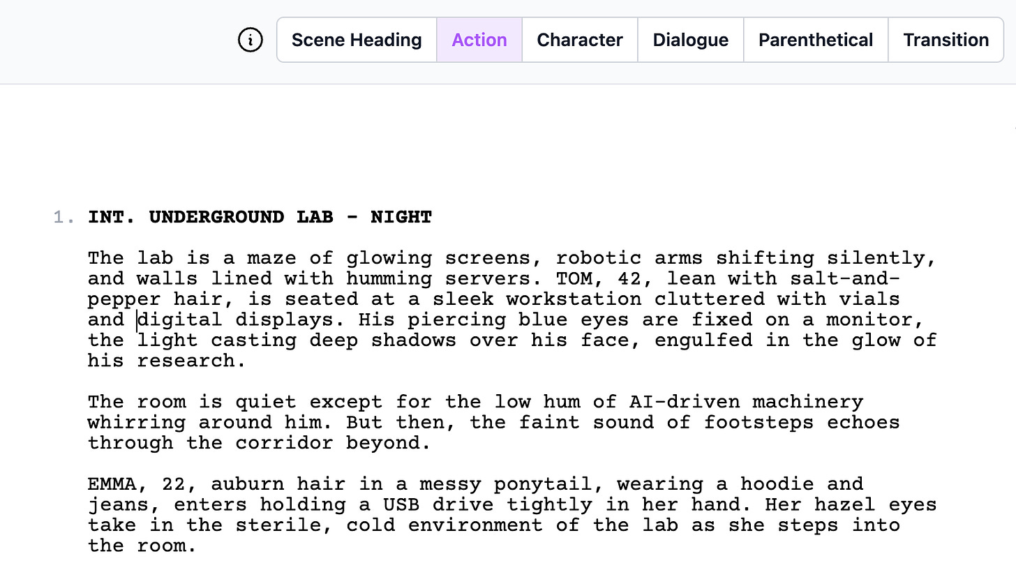 You now have a world-class screenwriting AI-assistant that knows every aspect of your story and characters, and can help you get unstuck whenever you need it!
