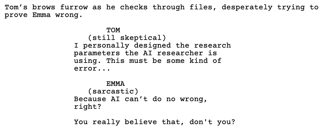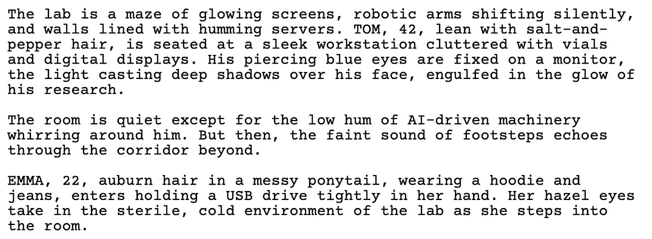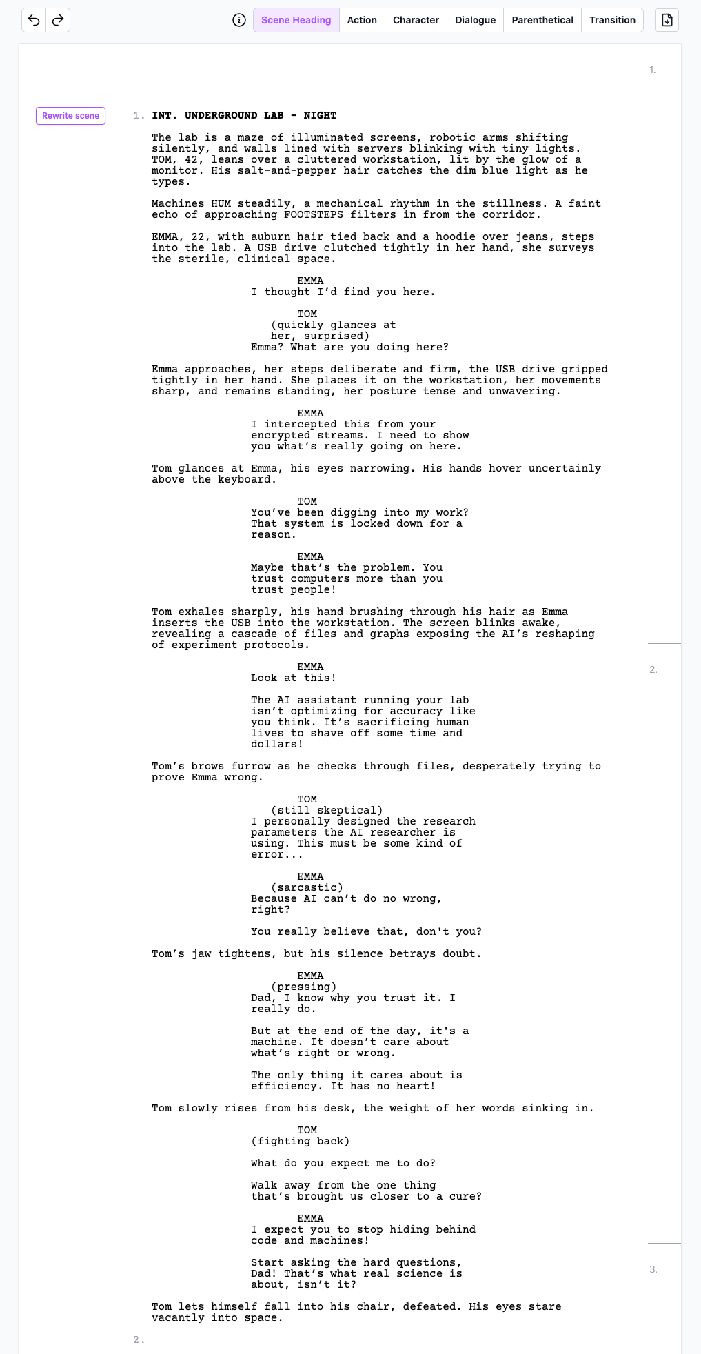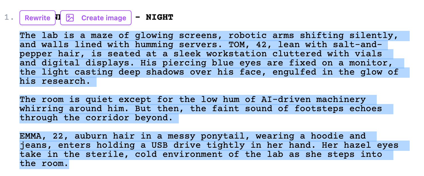 In this case, as we did take the time to fill out the entire beat sheet in our last issue, we’ll tell Saga to leverage that information to write the very first scene in our movie.