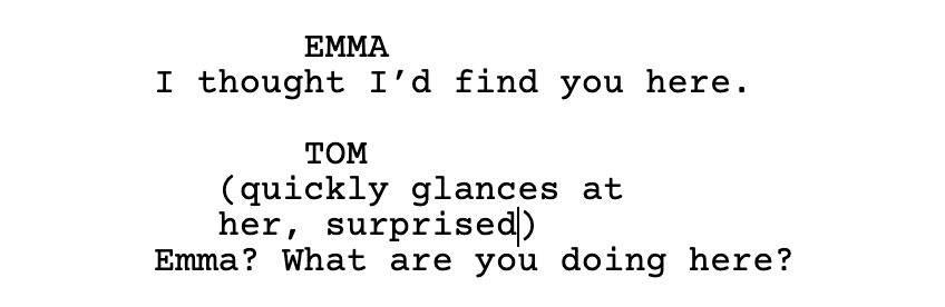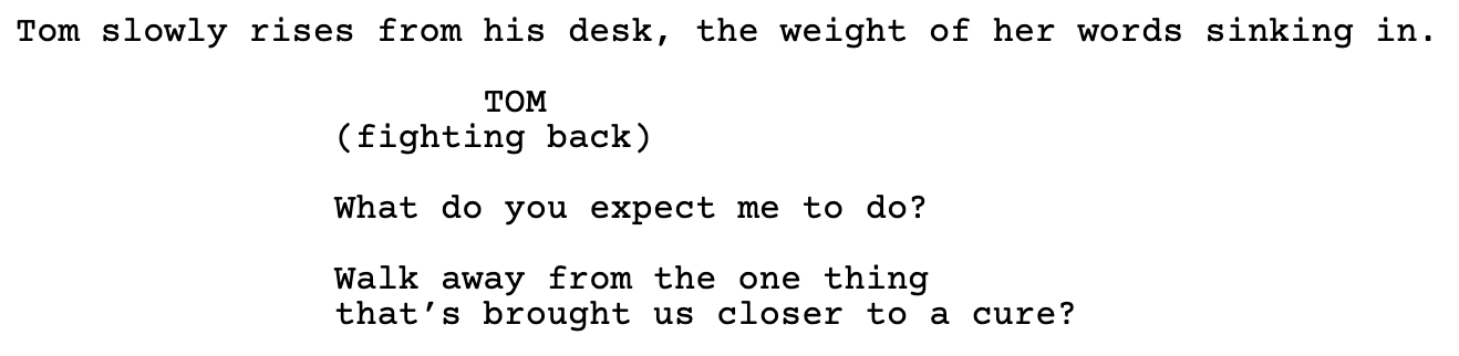The second question you should ask yourself when trying to get rid of action lines inside dialogue blocks is if what’s being said can be replaced by a quick parenthetical.