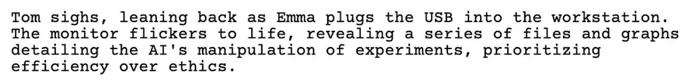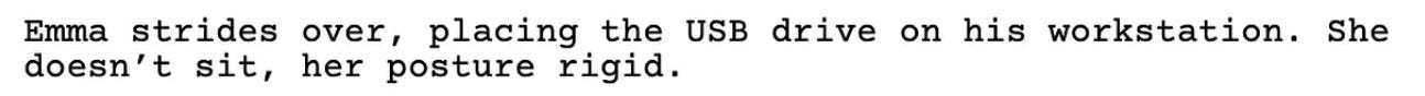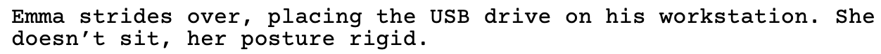 I was going to edit it myself to read “Emma strides over, places the USB drive on his workstation and points to the screen.”