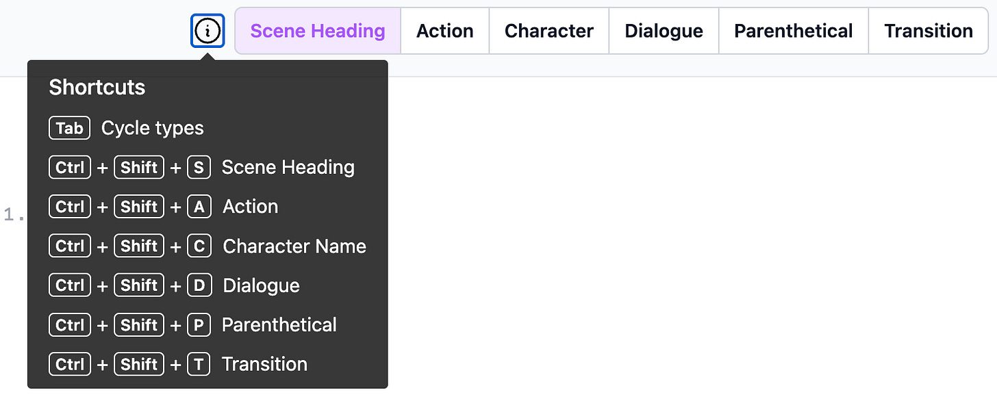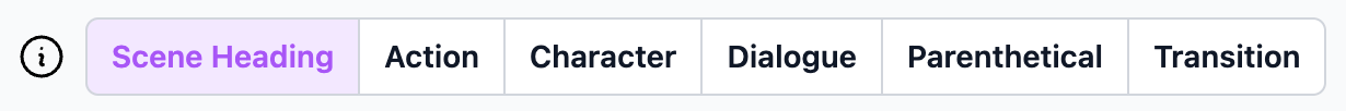 It’s important to know that these screenplay “elements” also appear in the top bar, from left to right, in the specific order we’ll find them inside a scene.