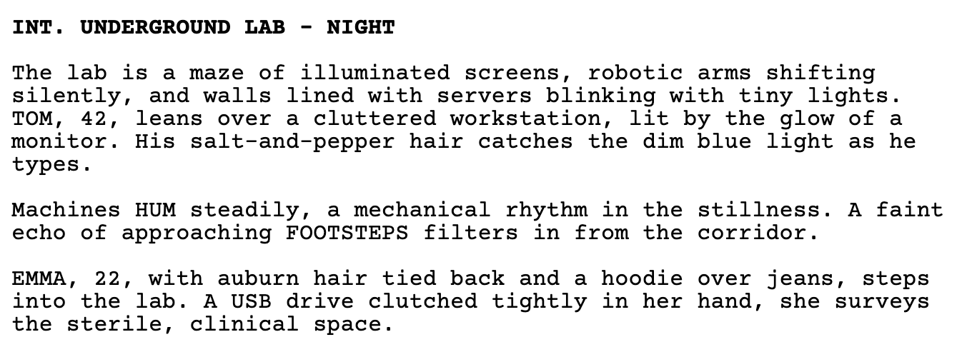 If you happen to be a professional screenwriter, this is probably all you need to know to start writing your scenes.