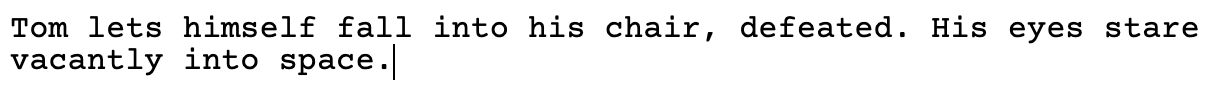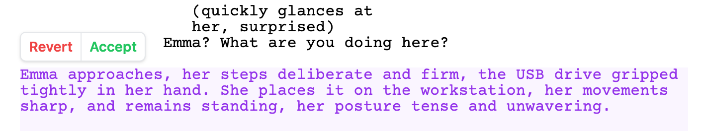 Here, I’ll manually edit out the unnecessary action line, adding the relevant information in a parenthetical instead: