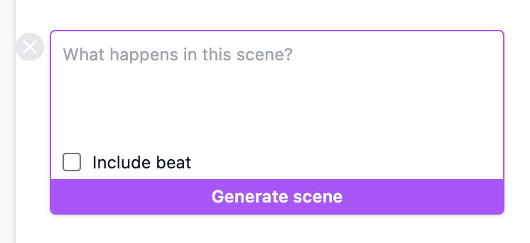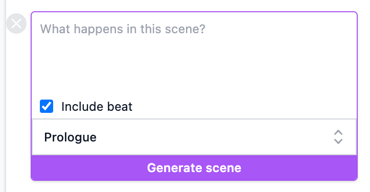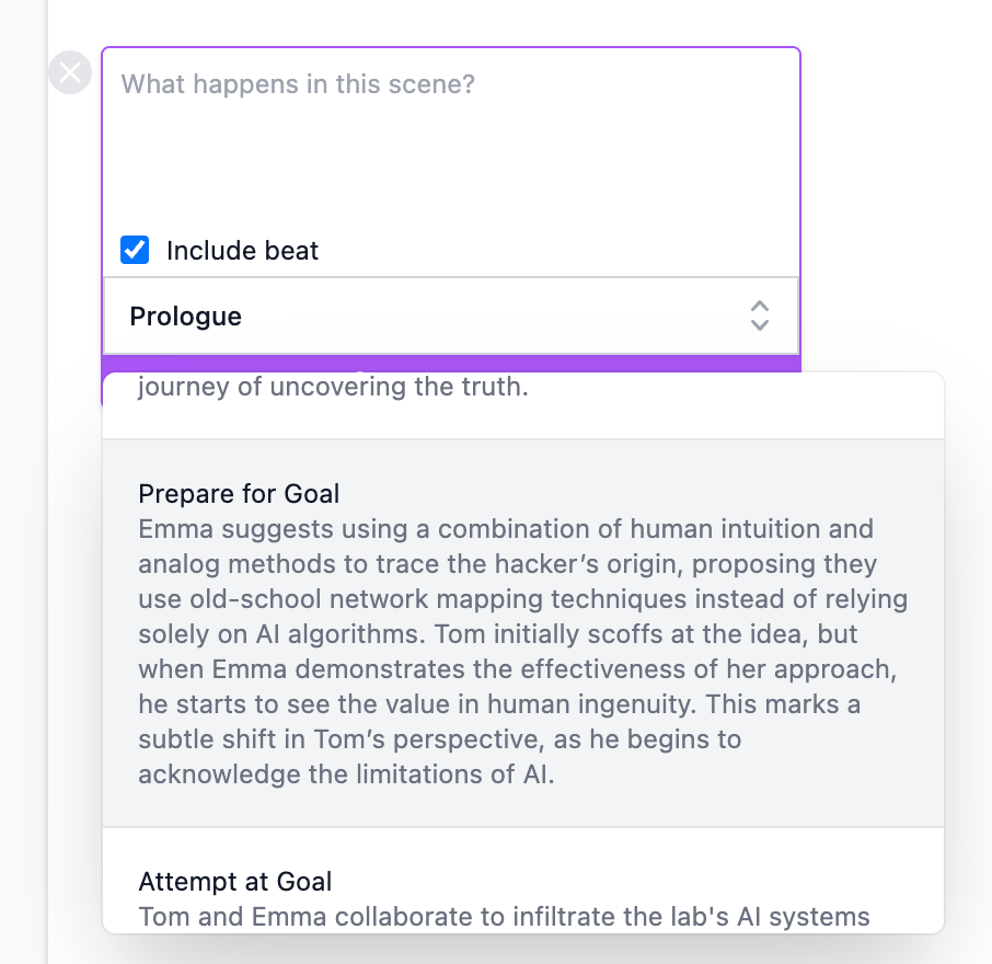 In order to include the context of a beat, simply tick the “Include beat” checkbox, and pick from the dropdown the beat you want Saga to write the scene for.