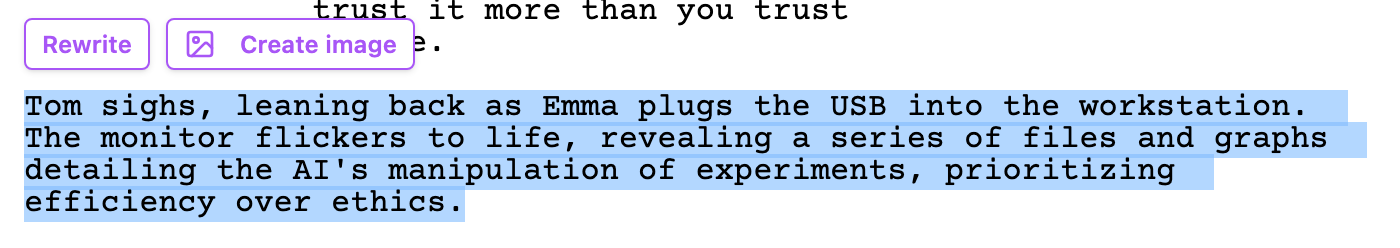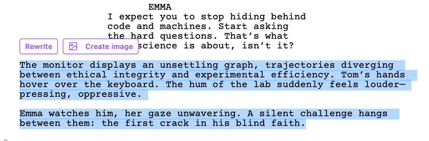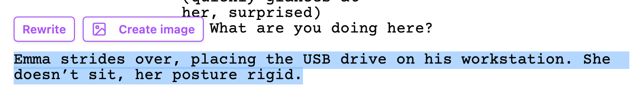 All you need to do to prove to yourself once and for all that the so dreaded “blank page syndrome” is something you’ll never have to experience again, is to ask Saga to write the draft of a scene for you.