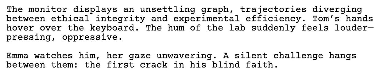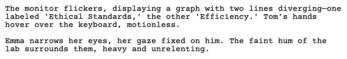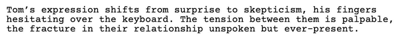 Saga is doing a great job with parentheticals here: contrary to ChatGPT or Claude that love to add a parenthetical to each piece of dialogue, Saga has only used a few in this entire scene. Good job Saga!