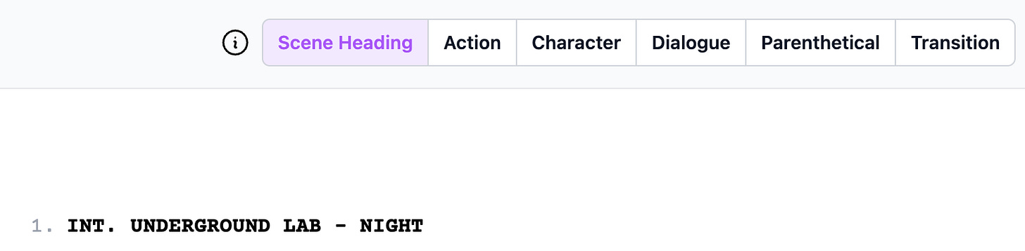 As you’ll find soon, every time you click inside a specific part of a scene –what we call an “element” of the screenplay– Saga will highlight in the top bar what type of element we’re editing (again guys, nice touch!)
